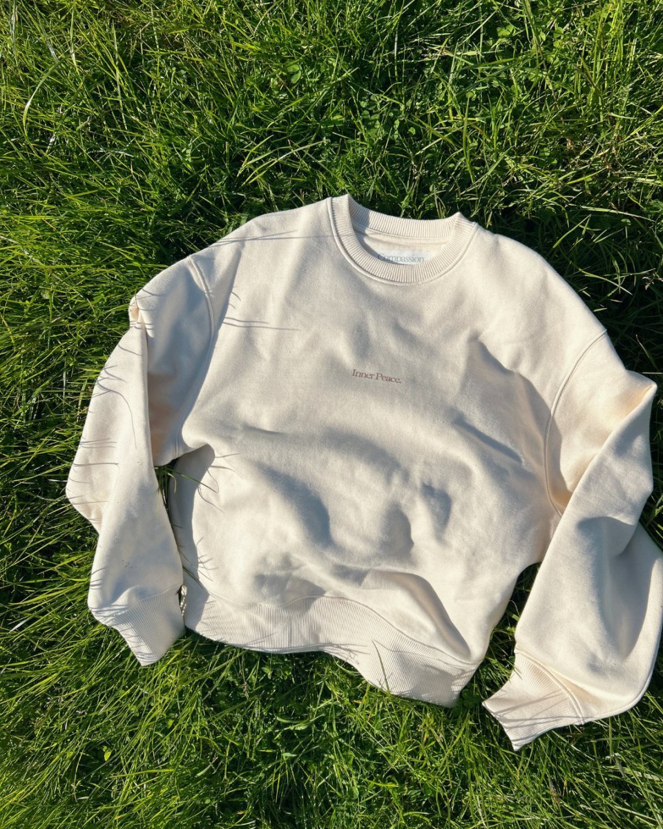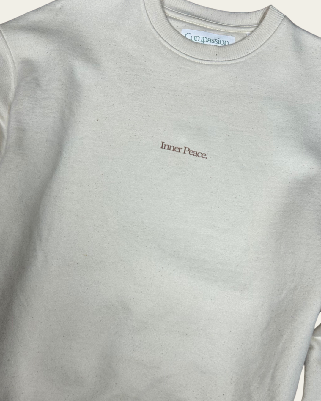 This Inner Peace sweatshirt is made with soft, cream coloured, 100% organic, sustainable ring spun cotton for ultimate comfort.